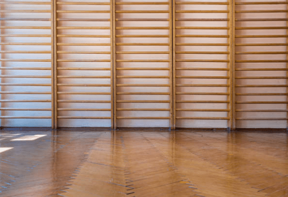 Els tallers el farem al gimnàs. Al fons hi ha un “potro” i un “plincton”, i també unes espatlleres d’aquestes que hi havia abans als gimnasos i que van subjectes a la paret. L’espai és ample, i podrem fer un bon cercle.